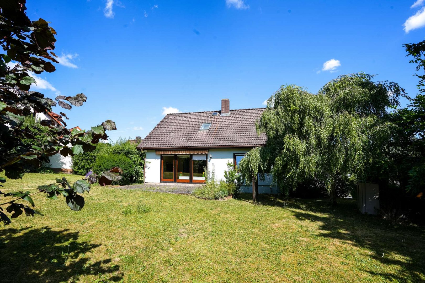 Der große Garten mit sonniger Terrasse lädt zum Entspannen ein. Sie können um das Haus herum laufen. Der Weg zum Haus führt über einen kleinen Treppenaufgang.