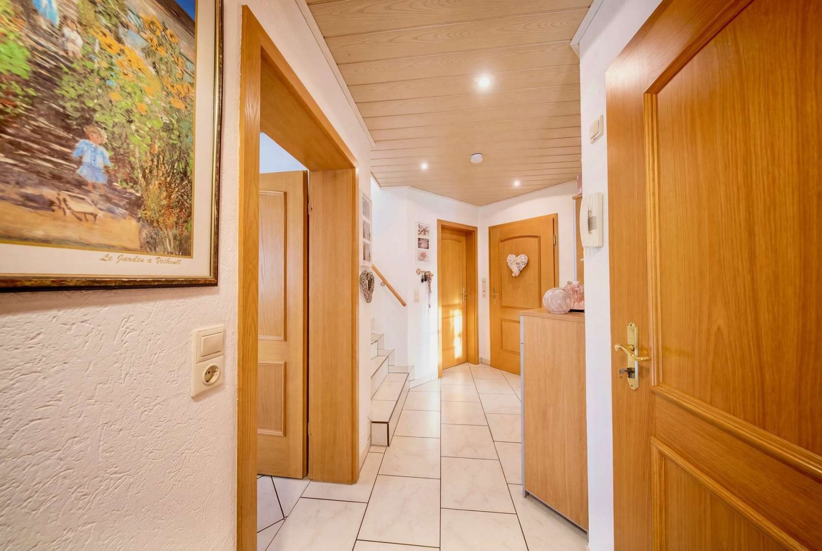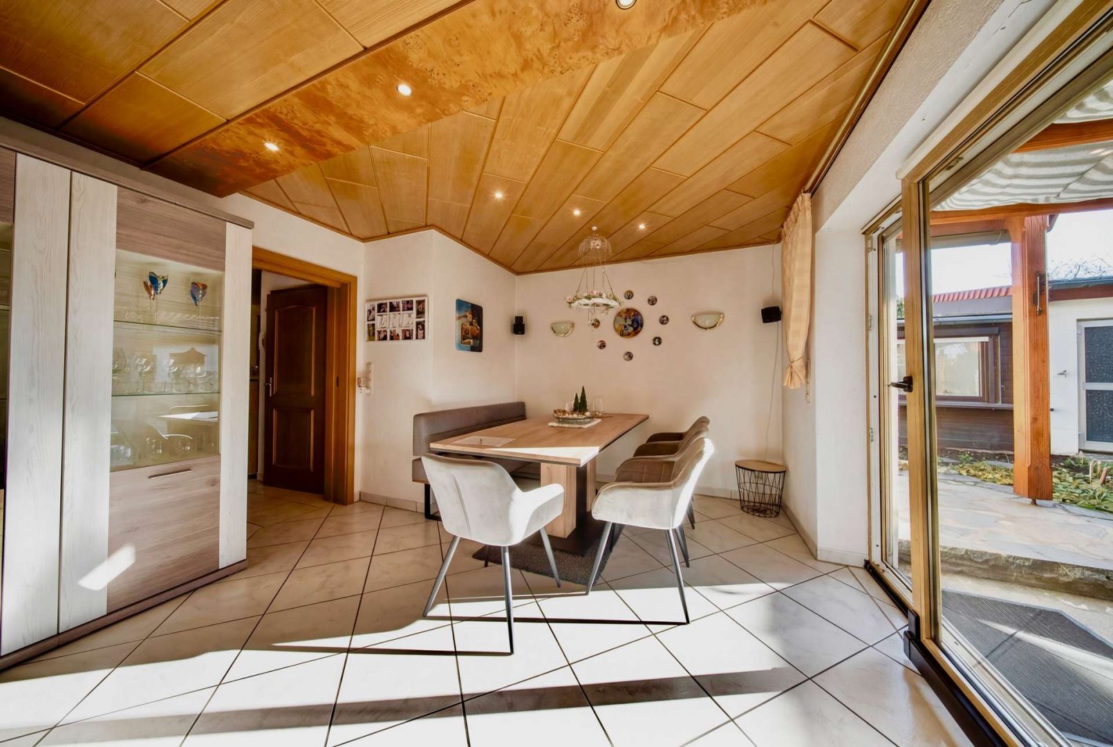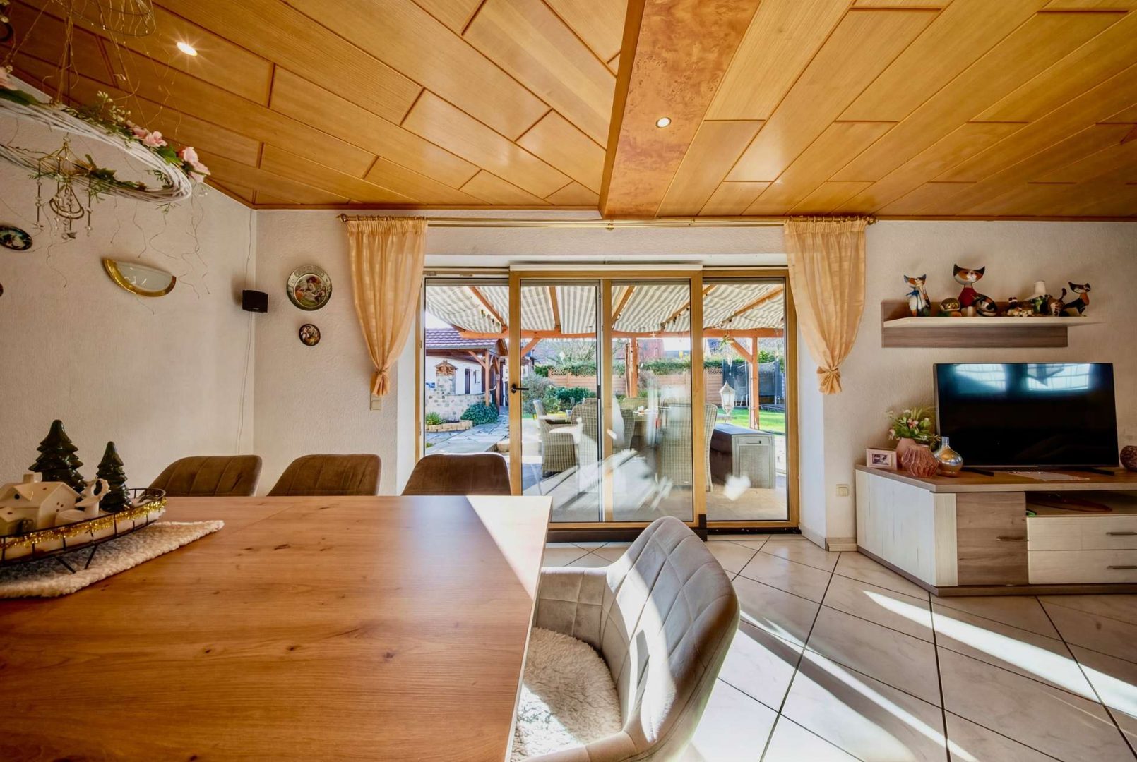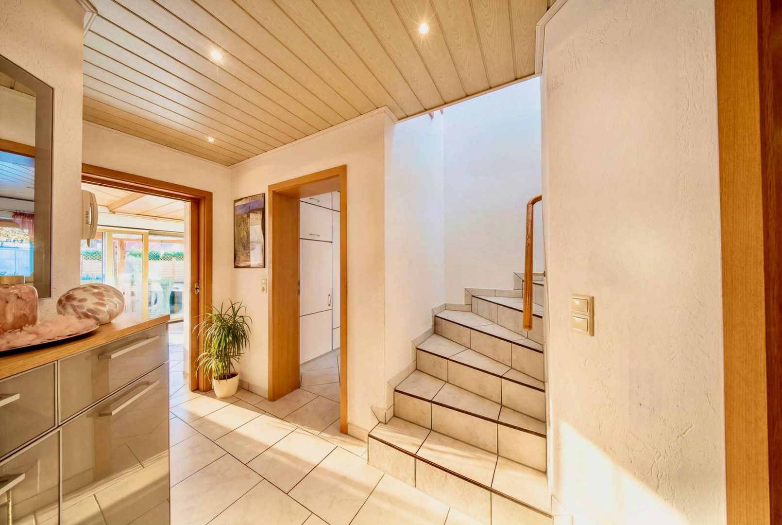 Im Haupthaus erwartet Sie ein helles Wohnzimmer mit Zugang zur überdachten Südterrasse, eine geräumige Wohnküche, Fußbodenheizung, Gäste-WC und Heizungsraum. Im Dachgeschoss befinden sich drei Schlafzimmer, ein Tageslichtbad, ein Duschbad, ein Hauswirtschaftsraum sowie zwei Dachböden als Stauraum.