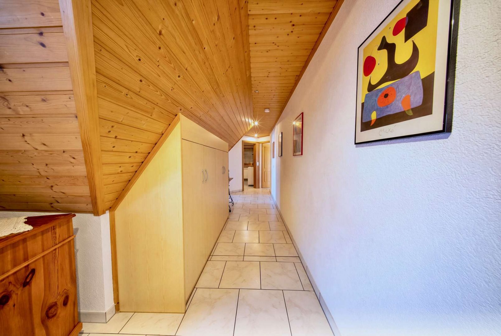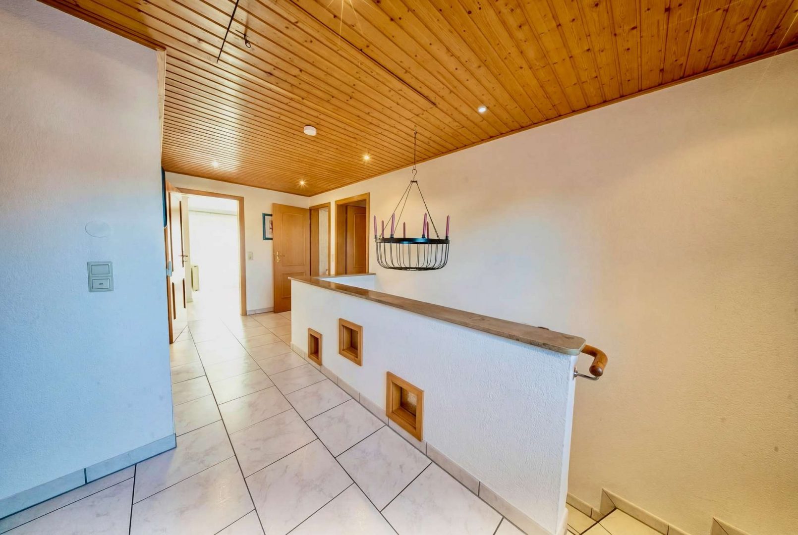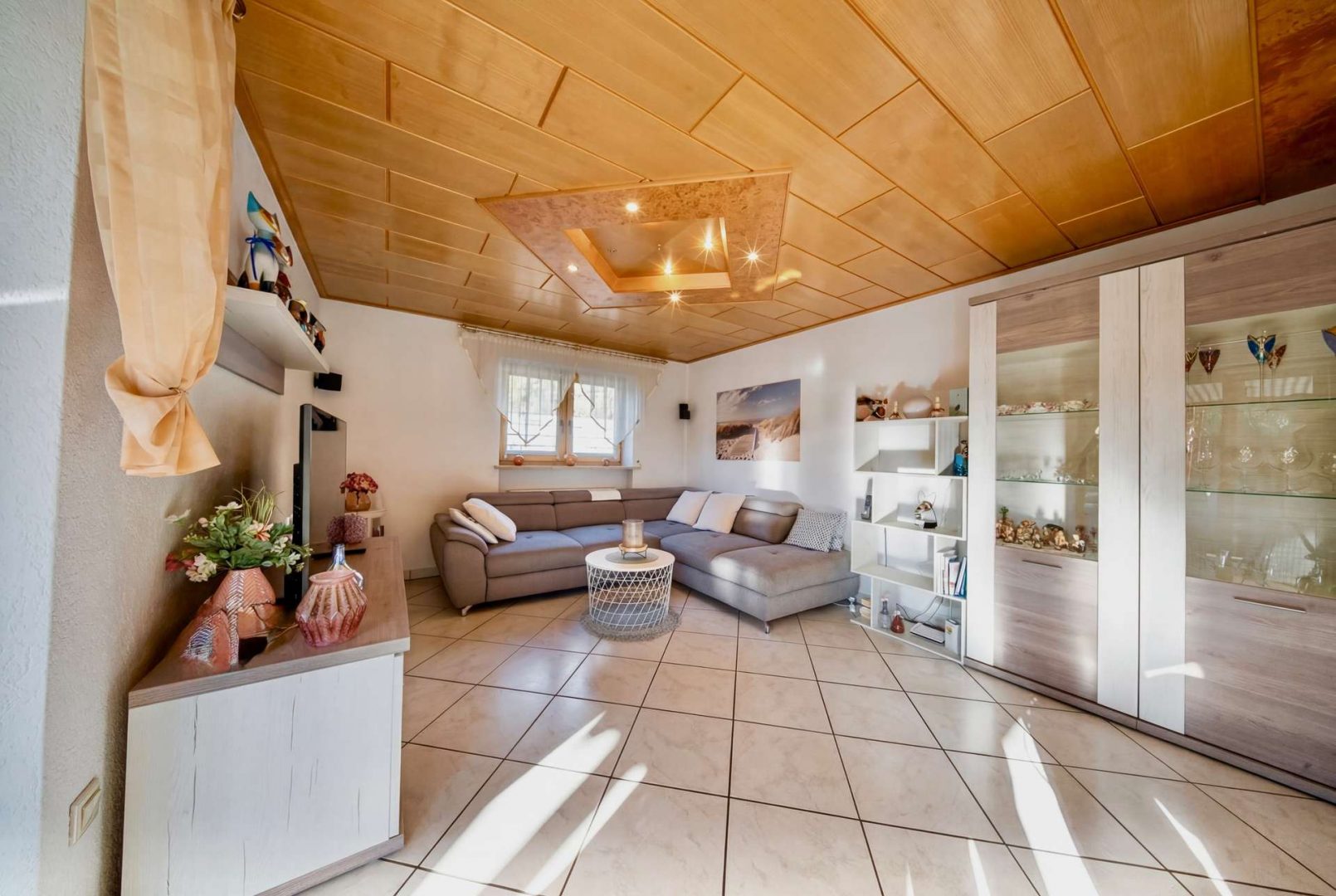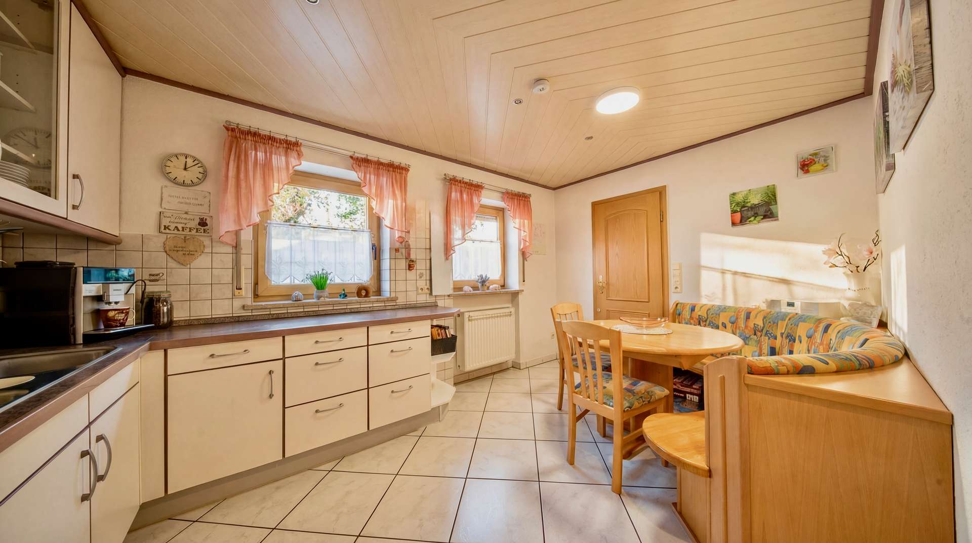 Im Haupthaus erwartet Sie ein helles Wohnzimmer mit Zugang zur überdachten Südterrasse, eine geräumige Wohnküche, Fußbodenheizung, Gäste-WC und Heizungsraum. Im Dachgeschoss befinden sich drei Schlafzimmer, ein Tageslichtbad, ein Duschbad, ein Hauswirtschaftsraum sowie zwei Dachböden als Stauraum.