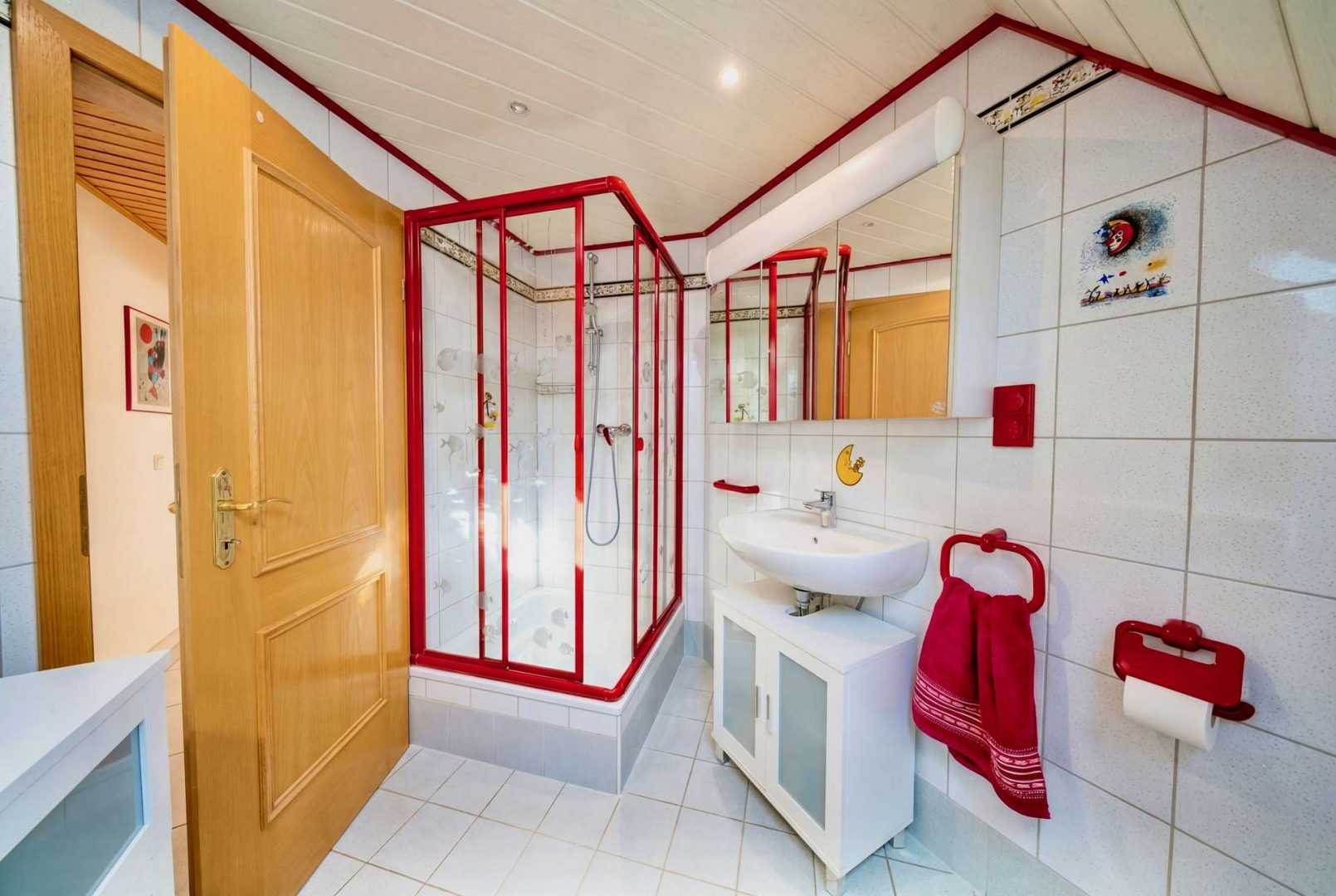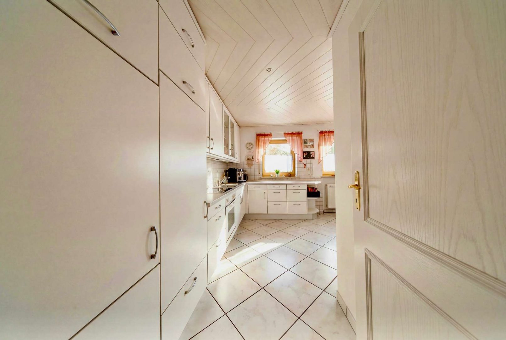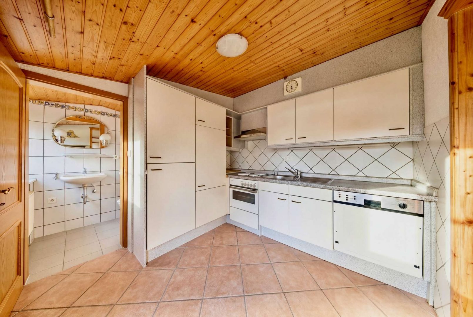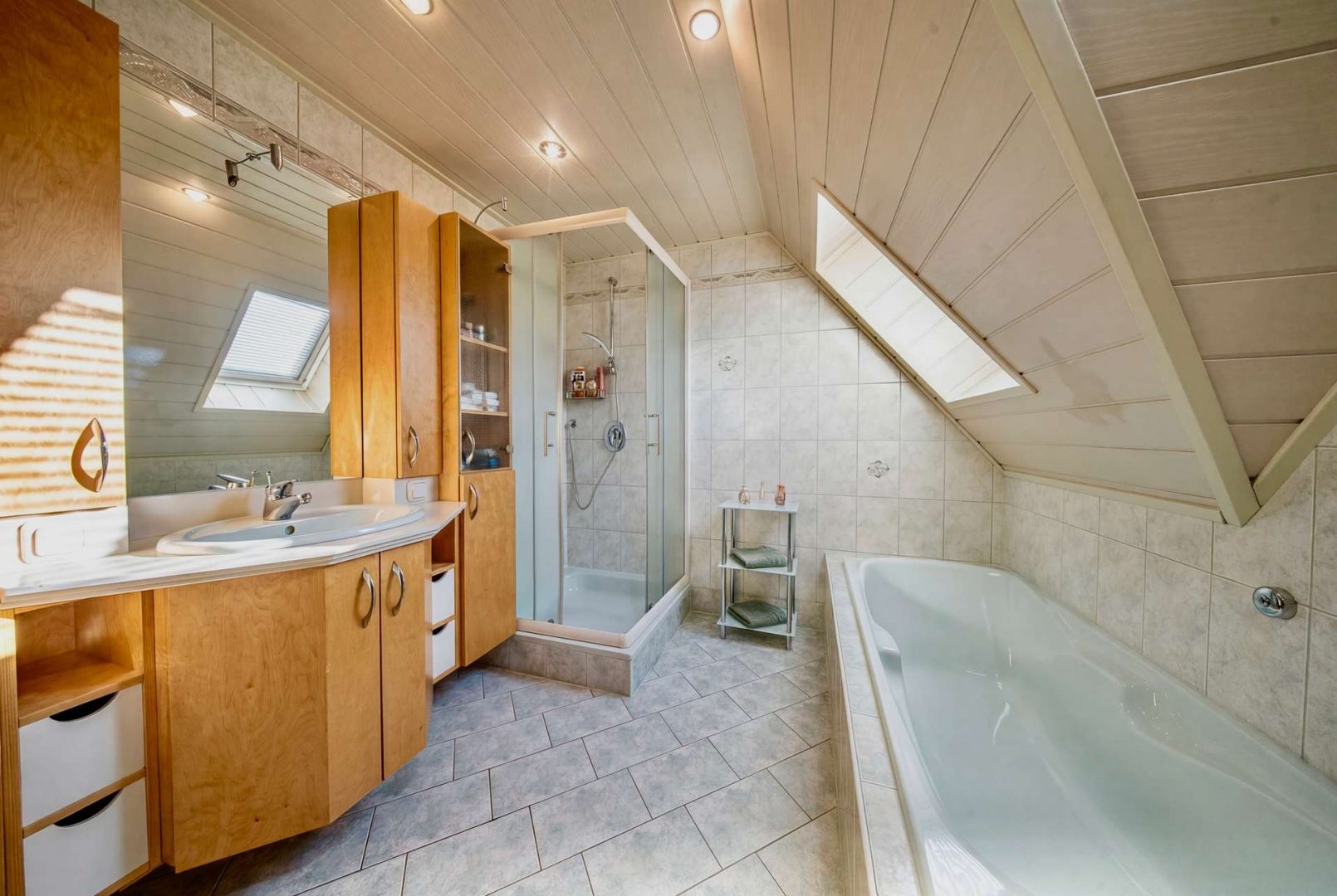 Im Haupthaus erwartet Sie ein helles Wohnzimmer mit Zugang zur überdachten Südterrasse, eine geräumige Wohnküche, Fußbodenheizung, Gäste-WC und Heizungsraum. Im Dachgeschoss befinden sich drei Schlafzimmer, ein Tageslichtbad, ein Duschbad, ein Hauswirtschaftsraum sowie zwei Dachböden als Stauraum.