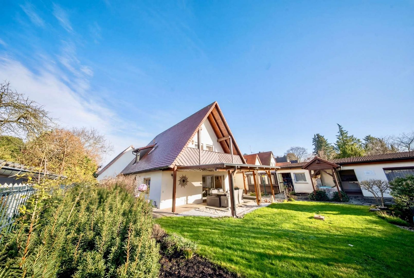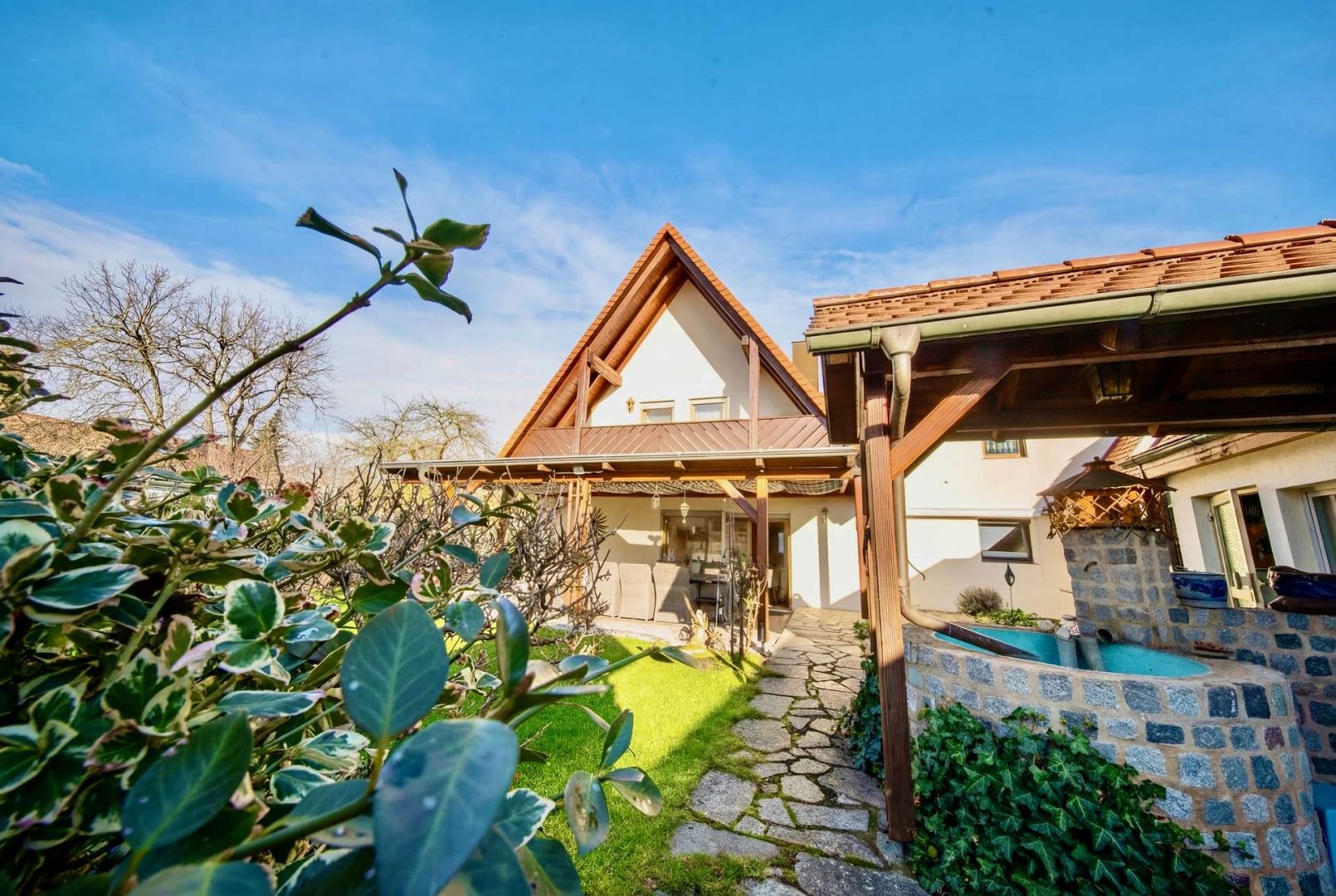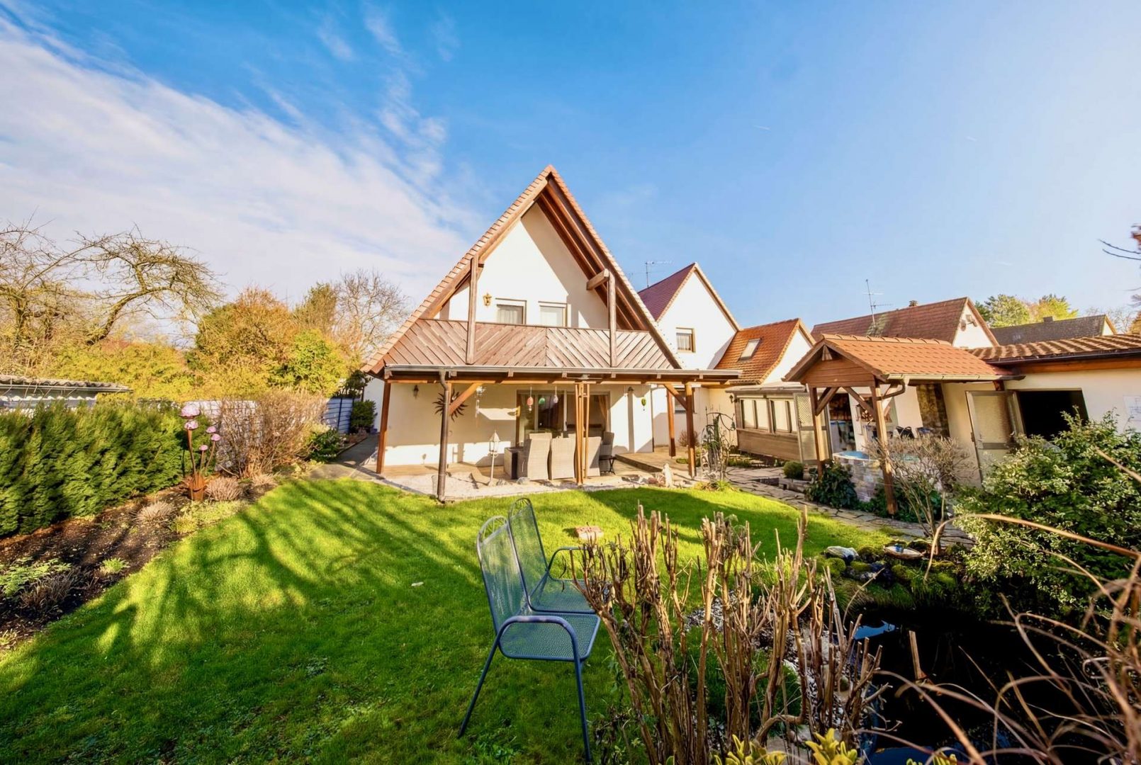 Besonders attraktiv sind die ruhige Lage, der eingewachsene Garten mit Fischteich, die große Terrasse sowie ein Party-Anbau mit eigener Küche, WC und Aufenthaltsraum.