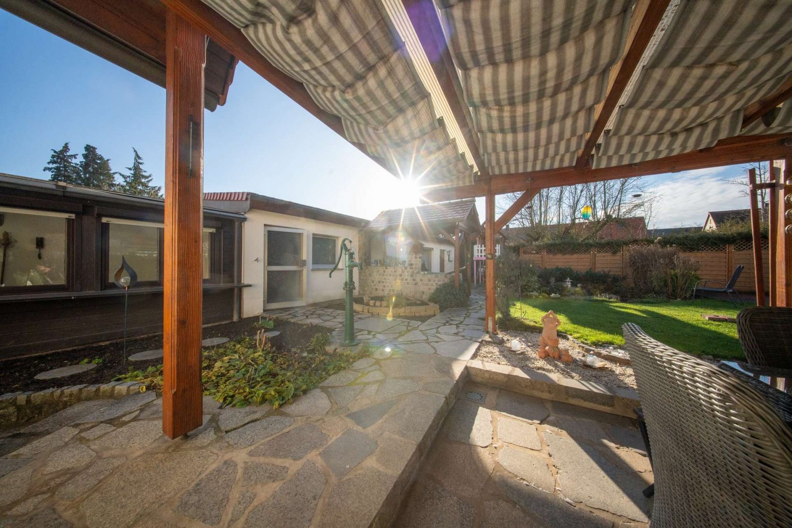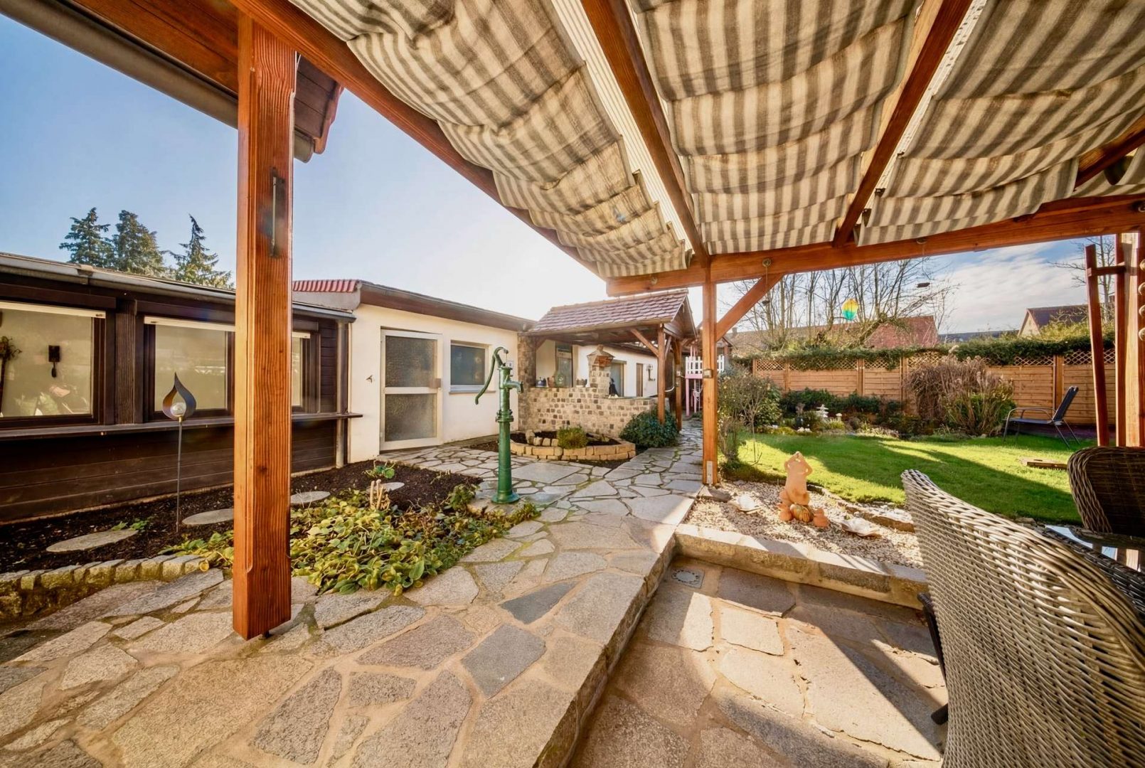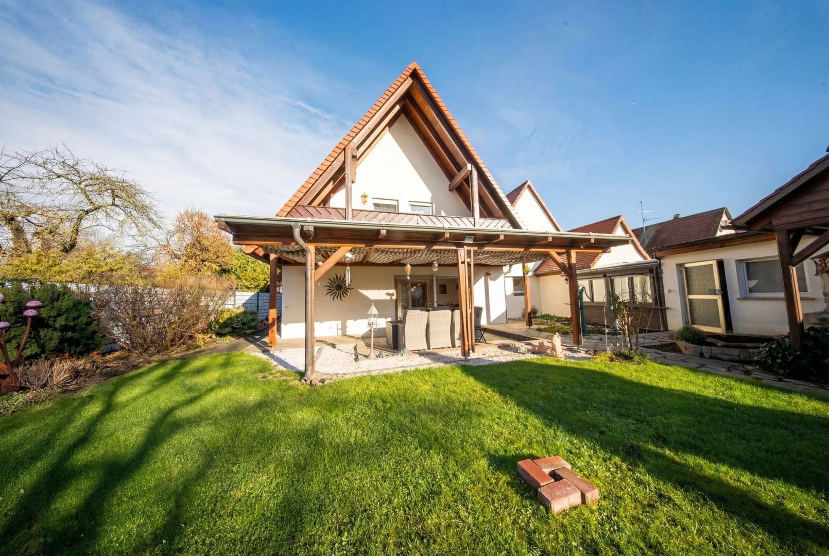 Besonders attraktiv sind die ruhige Lage, der eingewachsene Garten mit Fischteich, die große Terrasse sowie ein Party-Anbau mit eigener Küche, WC und Aufenthaltsraum.