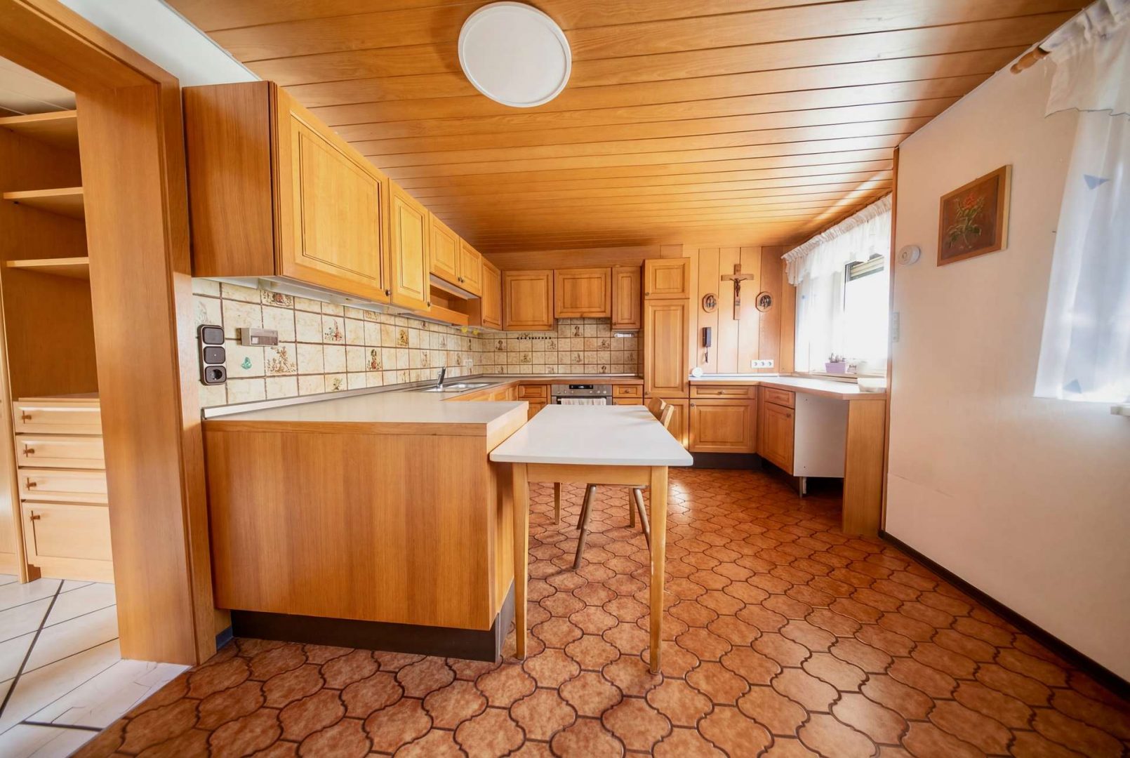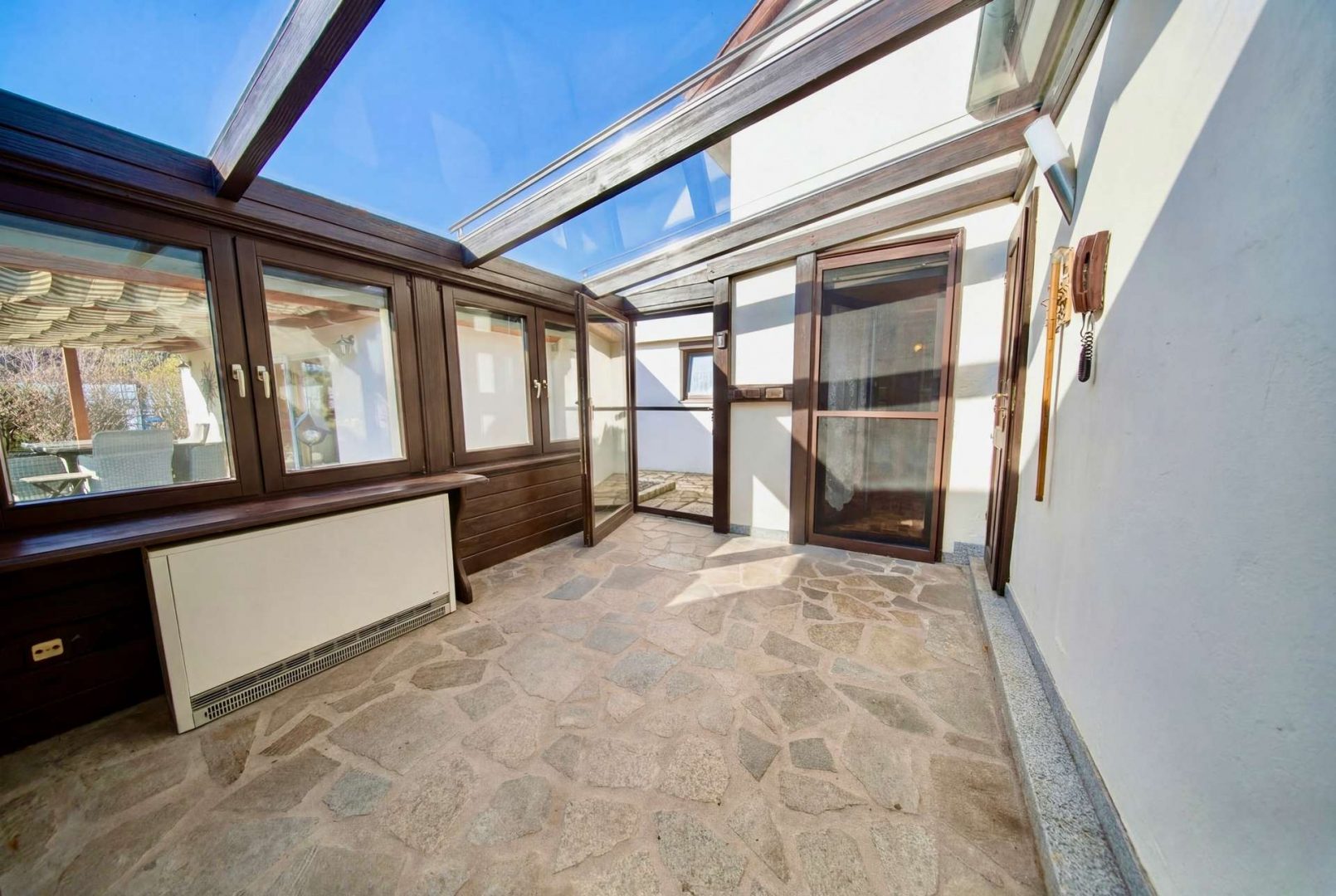 Die Einliegerwohnung bietet einen separaten Eingang, zwei große Zimmer, eine Wohnküche, ein Bad im Stil der 60er/70er Jahre sowie Zugang zu einem Wintergarten und weiteren Abstellräumen.