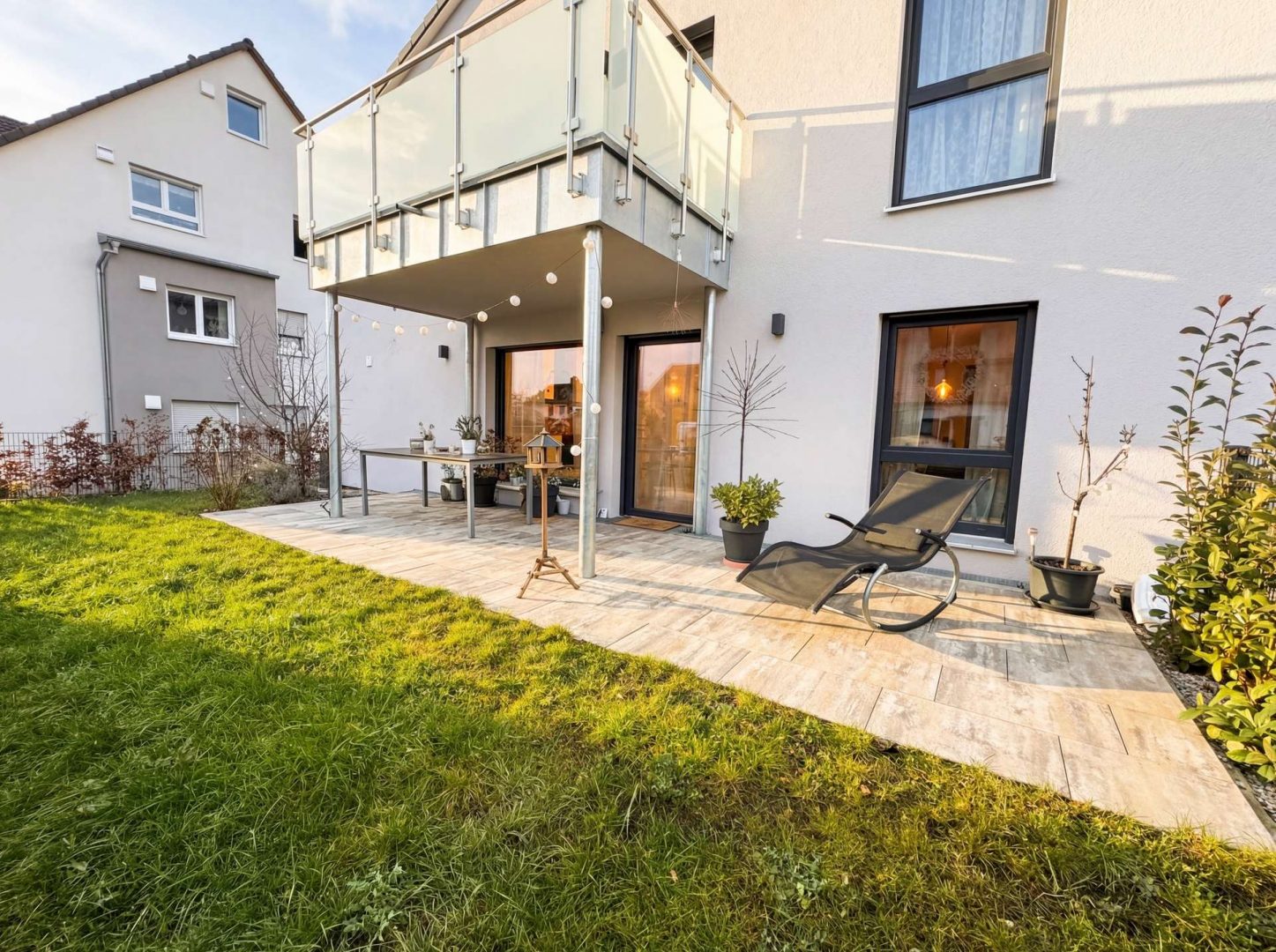 + Süd-Terrasse mit Terrassenplatten in Beton und eigenen Gartenanteil