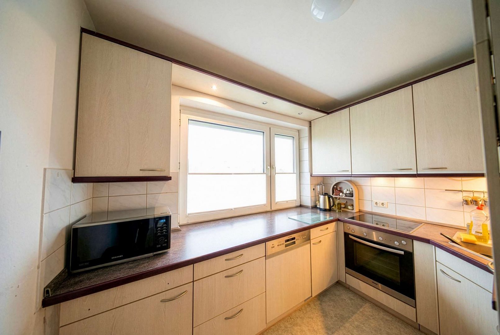 Der durchdachte Grundriss bietet drei gut geschnittene Zimmer sowie ein großzügiges Badezimmer, das sowohl mit Dusche als auch mit Badewanne ausgestattet ist. Die vorhandene Einbauküche verfügt über einen praktischen Abstellraum und bietet ausreichend Stauraum für den täglichen Bedarf.
