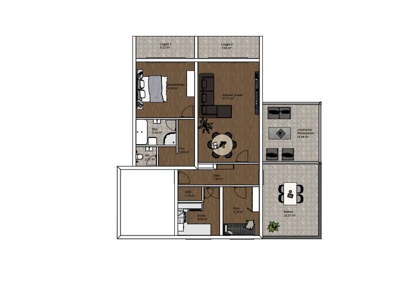 Ein besonderes Highlight der Wohnung ist der kalte Wintergarten, der den Wohnraum erweitert und vielfältige Nutzungsmöglichkeiten eröffnet. Ergänzt wird dieses Angebot durch eine zusätzliche Loggia, die weiteren Platz für entspannte Stunden im Freien bietet.
