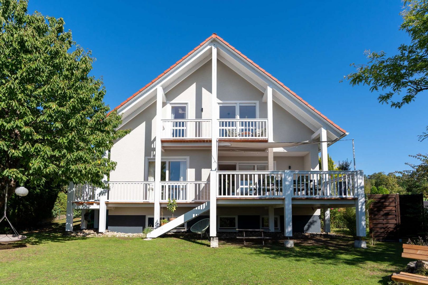 Über eine Holztreppe erreichen Sie direkt den pflegeleichten Garten, der dank vollständigen Sichtschutz maximale Privatsphäre bietet. Dort haben Ihre Kinder Platz zum Spielen im Freien.